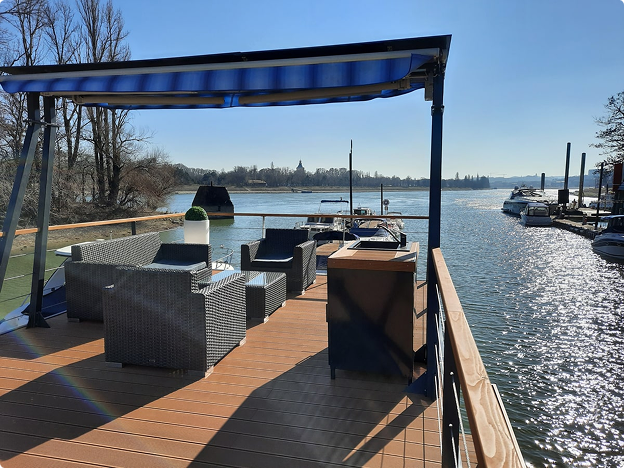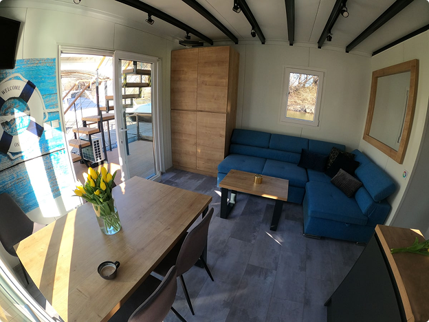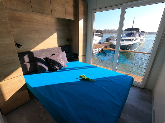 Az úszóház egyedülálló lehetőséget kínál a pihenés, szórakozás és akár üzleti találkozók lebonyolítására közvetlenül a vízen. A 72 m²-es pontonrendszerre épített, 32 m²-es lakótér minden funkciót biztosít, ami egy teljes értékű nyaralóhoz vagy vendégházhoz szükséges. A konyha-nappali, franciaágyas hálószoba, dolgozó- vagy gyerekszoba, valamint a fürdőszoba maximális kényelmet nyújt hosszabb tartózkodás esetén is. A körbejárható alsó terasz és a tágas tetőterasz különleges szabadságérzetet ad, miközben a vízi élet minden előnyét élvezhetjük kompromisszumok nélkül.
